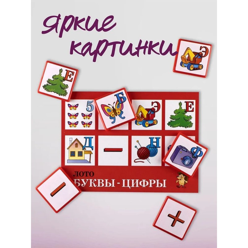 Лото “Буквы-цифры” знакомит с буквами русского алфавита, учит выделять первый звук в слове, тренирует порядковый и количественный счет, способствует визуальному запоминанию букв и цифр.
