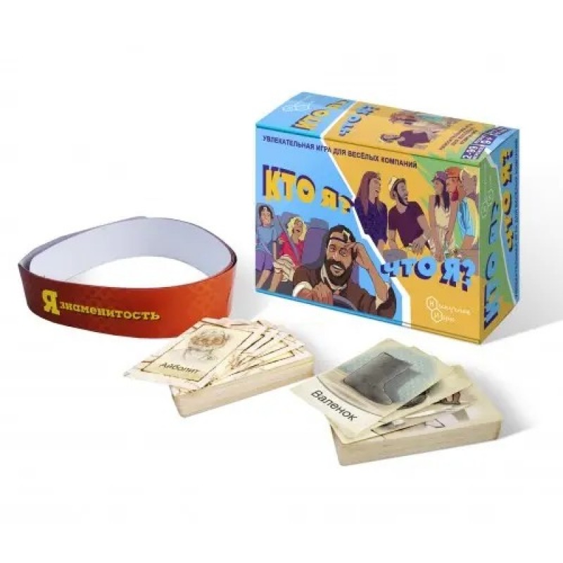 Кто я, что я? - веселая игра для компании. Цель игры: с помощью наводящих вопросов отгадать, что ты за персонаж или предмет. В состав игры входят 2 колоды карточек с изображениями известных личностей и предметов. А также 4 картонных обруча на голову с держателем для карточки. Перед началом игры каждый игрок надевает на голову обруч. Затем, не глядя, вставляет 1 карточку в прорезь на обруче. Рисунок на карточке определяет роль игрока в этом раунде. Таким образом, сам игрок не знает, кто он, а остальные участники знают (видят карточку в его обруче). Игроки по очереди задают вопросы, стараясь определить свою роль. На вопросы можно отвечать только Да или Нет. Тот игрок, которые первым правильно назовет, кто он, побеждает. Благодаря тому, что в состав входят карточки и с героями, и с предметами, игра будет интересна и детям, и взрослым. В колоде карточек с героями можно встретить и исторические личности (Иван Сусанин, Колумб), и знаменитых актеров (Джеки Чан, Юрий Никулин), и вымышленных персонажей (Айболит, Баба Яга, Человек Паук). Также в наборе есть пустые карточки, которые Вы сможете заполнить самостоятельно.