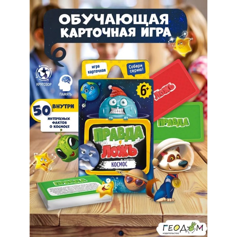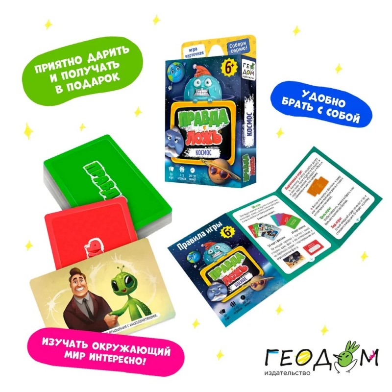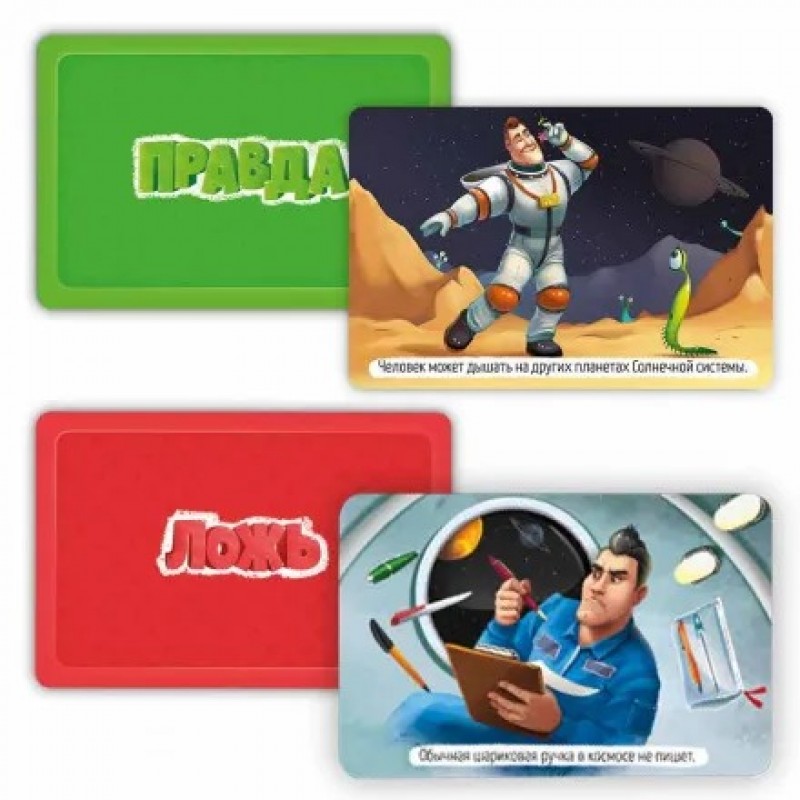 Эта карточная настольная игра – находка для любознательных детей и их родителей! На карточках – 50 интересных фактов о тайнах космоса и замечательные смешные иллюстрации. Сможете ли вы разобраться, где правда, а где ложь? Играйте – будет интересно! Подходит для совместного семейного времяпрепровождения.