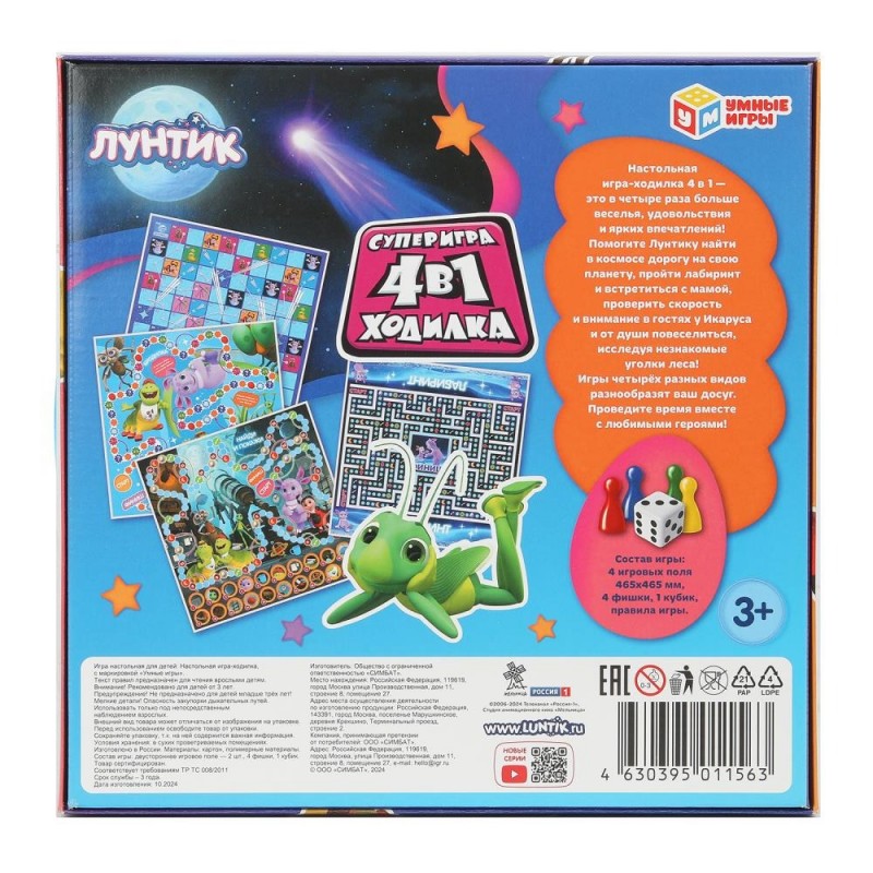 Настольная игра-ходилка 4 в 1 – это в четыре раза больше веселья, удовольствия и ярких впечатлений! Помогите Лунтику найти в космосе дорогу на свою планету, пройти лабиринт и встретиться с мамой, проверить скорость и внимание в гостях у Икаруса и от души повеселиться, исследуя незнакомые уголки леса! Игры четырёх разных видов помогут ребёнку разнообразить досуг и провести время вместе с любимыми героями!
