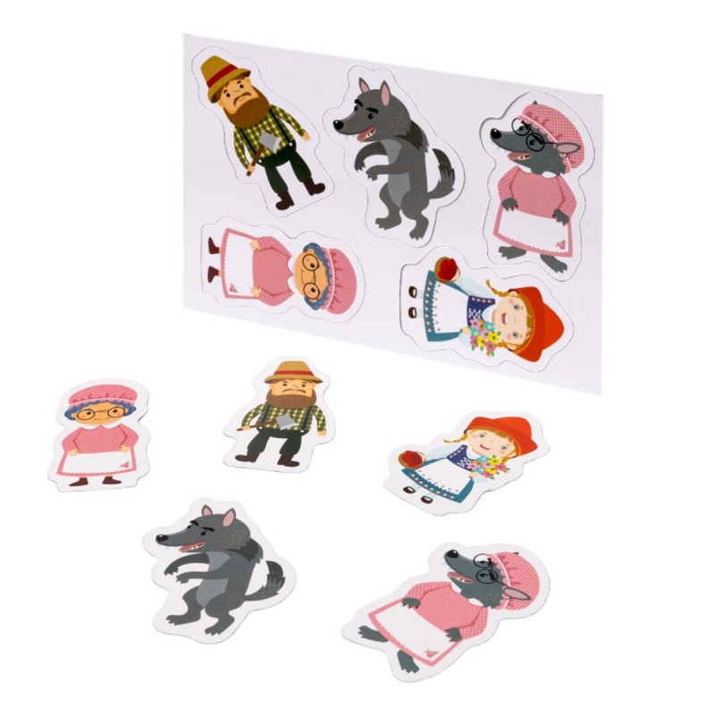 В комплект входят 5 магнитов: Красная Шапочка, волк, бабушка, волк в одежде бабушки и дровосек.