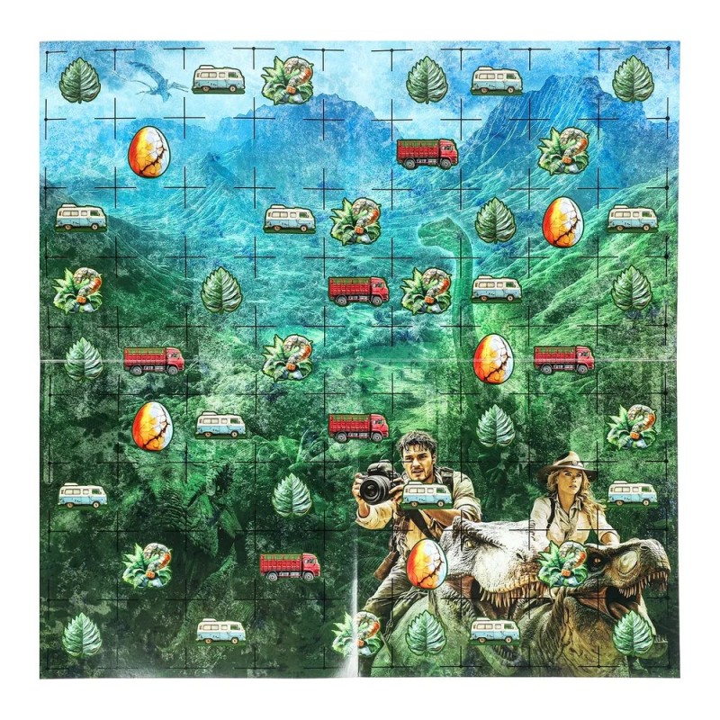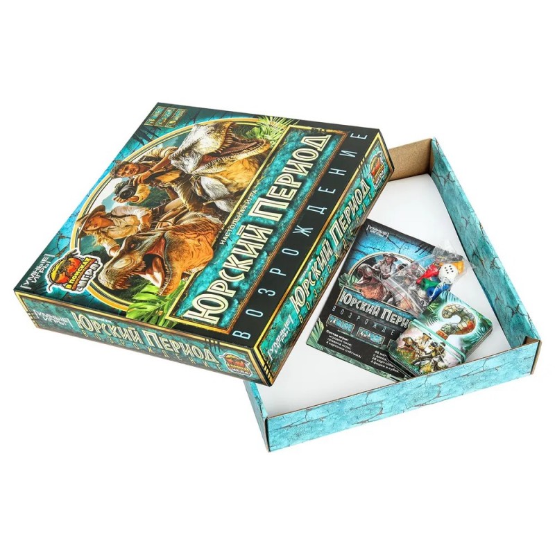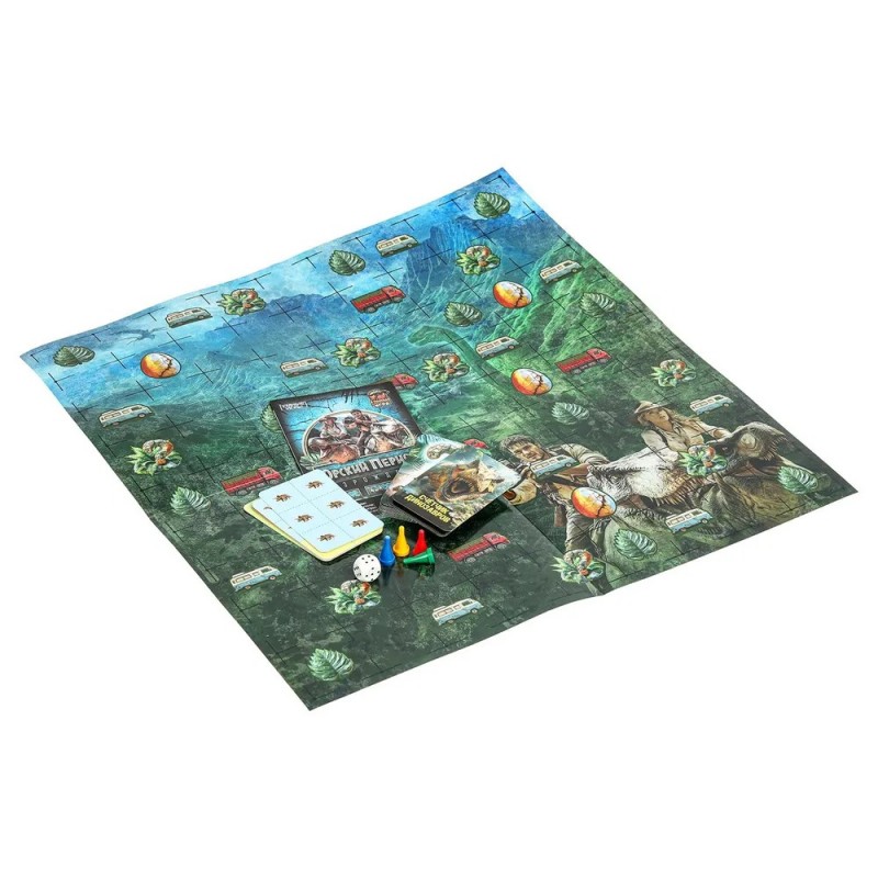- 40 карт: 4 карточки-счётчика, 8 карт с 48 вырезными жетонами с динозаврами, 28 карт-событий