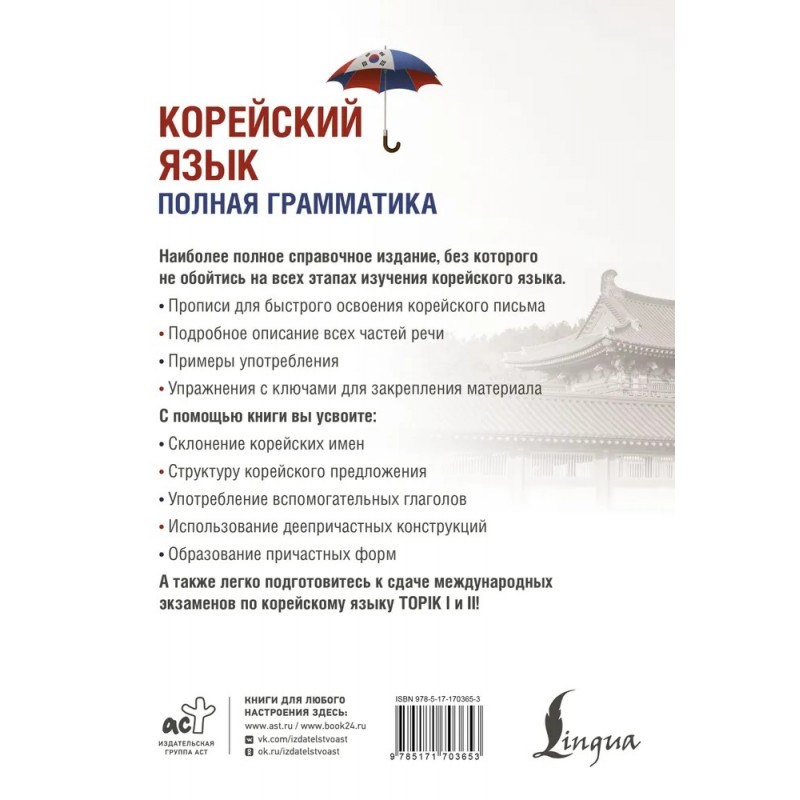 Данное учебное пособие разработано признанными специалистами в области корееведения в России Чун Ин Сун и Анастасией Викторовной Погадаевой и включает подробное описание самой важной грамматики корейского языка. В пособии представлены подробные таблицы и схемы, емко и наглядно иллюстрирующие даже самые сложные и непонятные грамматические правила корейского языка. Грамматика дается последовательно — от простого к сложному, поэтому книга отлично подойдет не только для начинающих, но и для тех, кто уже изучает корейский язык на продвинутом уровне. В пособии также содержатся задания и упражнения, которые помогут быстрее закрепить пройденный материал и позволят проверить свои знания по ключам в конце учебника. Издание предназначено для читателей, начинающих изучать корейский язык самостоятельно и нацеленных на качественное овладение языком, а также для студентов высших языковых и неязыковых учебных заведений, изучающих корейский язык.