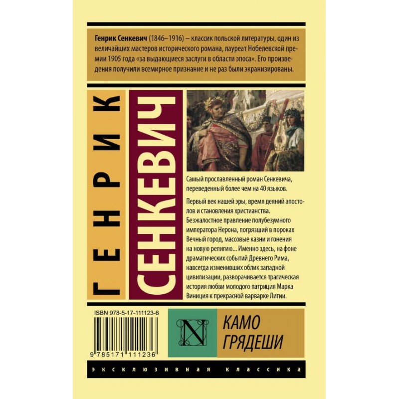 Самый прославленный роман Сенкевича, переведенный более чем на 40 языков. Первый век нашей эры, время деяний апостолов и становления христианства. Безжалостное правление полубезумного императора Нерона, погрязший в пороках Вечный город, массовые казни и гонения на новую религию… Именно здесь, на фоне драматических событий Древнего Рима, навсегда изменивших облик западной цивилизации, разворачивается трагическая история любви молодого патриция Марка Виниция к прекрасной варварке Лигии.