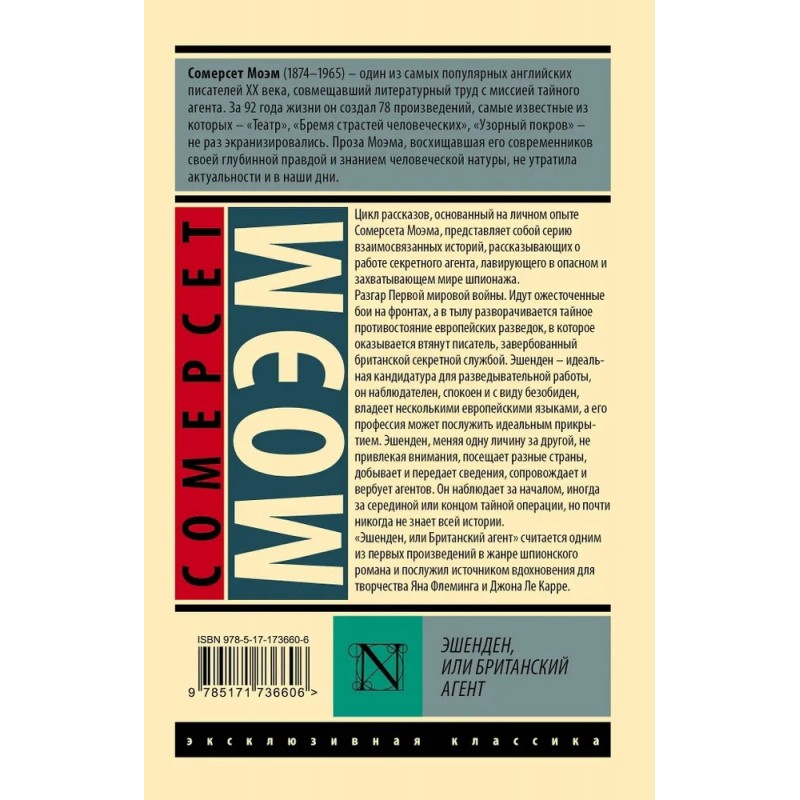 От автора романов «Луна и шесть пенсов» и «Бремя страстей человеческих». Издание в серии «Эксклюзивная классика» — в удобном карманном формате и узнаваемом оформлении. В Европе бушует Первая мировая война. На фронте идут ожесточенные бои, а в тылу разворачивается тайное противостояние разведок противоборствующих стран. В это противостояние оказывается втянут писатель Эшенден — наблюдательный, спокойный и безобидный с виду, словом, идеальная кандидатура для разведывательной работы. Меняя личины, Эшенден посещает одну страну за другой, собирая и передавая сведения и вербуя новых агентов.