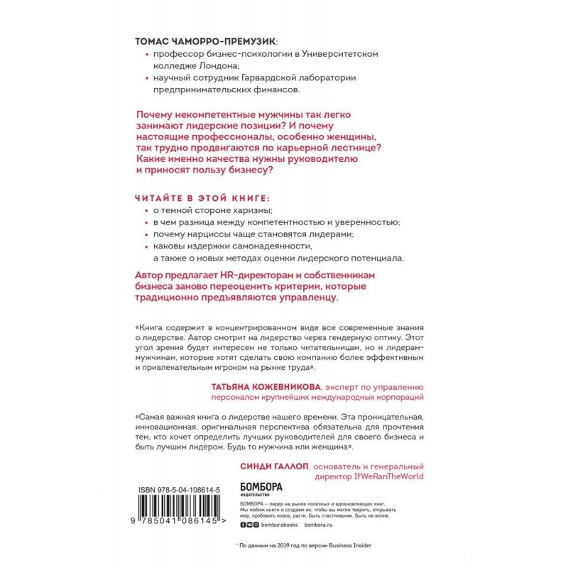 Как отличить харизматика от эгоистичного и заносчивого и нарцисса? Почему некомпетентные мужчины так легко занимают лидерские позиции? И почему же профессионалы, особенно женщины, так трудно продвигаются по карьерной лестнице? Своими провокационными вопросами автор книги «Ловушка некомпетентности» меняет сформированное представление о человеке, ведущем команду к победе. Томас Чаморро-Премузик — профессор психологии бизнеса в Университетском колледже Лондона. Он заставляет читателя задуматься, какие именно качества нужны руководителю и действительно приносят пользу бизнесу.
